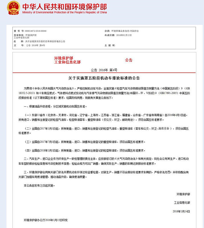 (一)東部11省市(北京市、天津市、河北省、遼寧省、上海市、江蘇省、浙江省、福建省、山東省、廣東省和海南省)自2016年4月1日起,所有進(jìn)口、銷售和注冊(cè)登記的輕型汽油車、輕型柴油客車、重型柴油車(僅公交、環(huán)衛(wèi)、郵政用途),須符合國五標(biāo)準(zhǔn)要求。