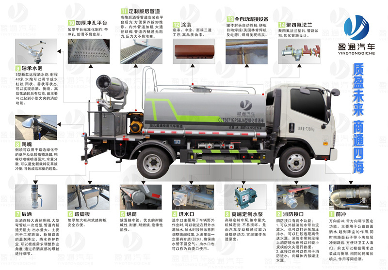 藍牌灑水車_藍牌抑塵車_國六三方霧炮車_湖北盈通專用汽車有限公司,該車用途為抑塵降霾.主要裝置為罐體及噴霧裝置;罐體有效容積:2.5立方米;罐體外形尺寸(長×長軸×短軸)(mm):2250×1400×1050;ABS型號為CM4YL,生產廠家為廣州瑞立科密汽車電子股份有限公司;側、后防護材料均為:Q235碳鋼,連接方式均為:螺栓連接,后部防護截面尺寸(mm):120×50,后部防護離地高度(mm):400.隨底盤選裝前部LOGO及格珊風格。選裝噴霧裝置樣式。 |